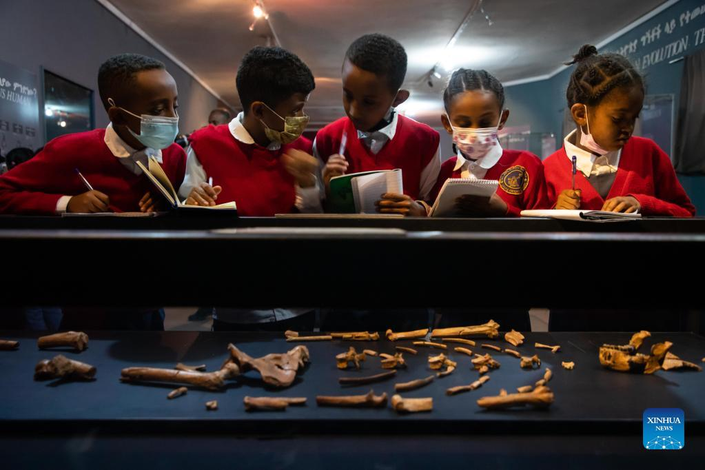 Students visit the National Museum of Ethiopia in Addis Ababa, Ethiopia, on May 18, 2022. The museum houses collections of precious heritages, including fossilized bones of a female of the hominin species Australopithecus afarensis, named "Lucy", which is believed to live about 3.2 million years ago. (Xinhua/Michael Tewelde)