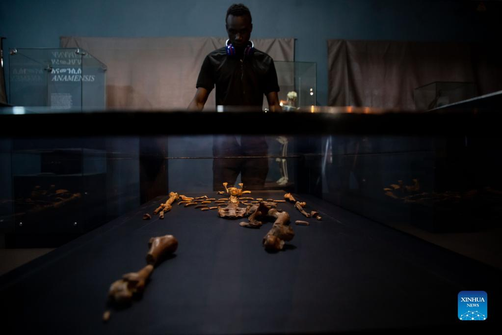 A man looks at the replica of Lucy's bones at the National Museum of Ethiopia in Addis Ababa, Ethiopia, on May 18, 2022. The museum houses collections of precious heritages, including fossilized bones of a female of the hominin species Australopithecus afarensis, named "Lucy", which is believed to live about 3.2 million years ago. (Xinhua/Michael Tewelde)