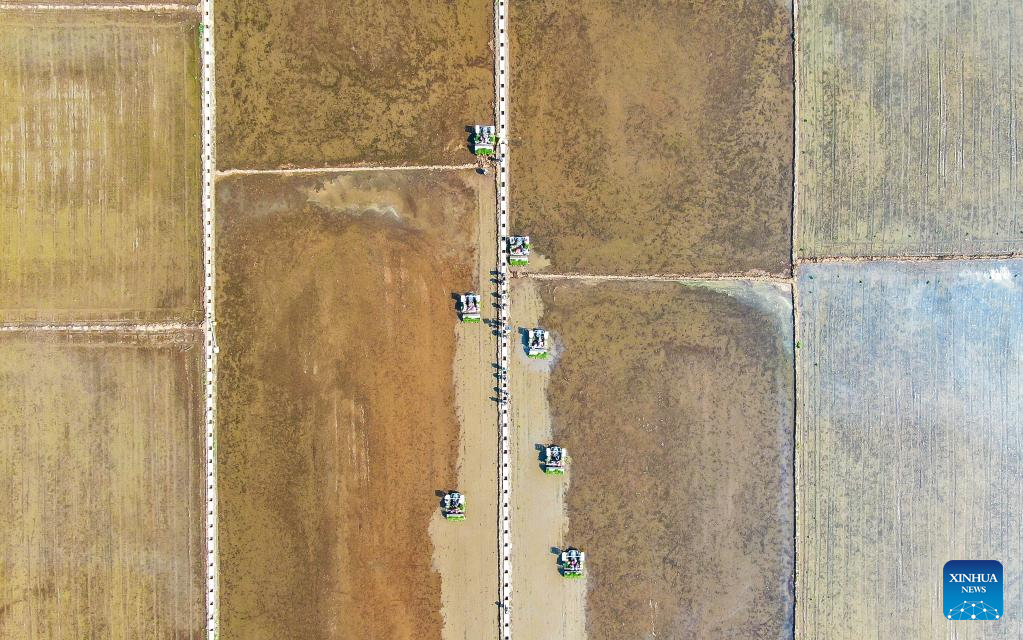 Aerial photo taken on May 13, 2022 shows farmers transplanting rice seedlings in Xintaizi Township of Tieling, northeast China's Liaoning Province. Liaoning has stepped up efforts on farming activities as the temperature rises recently. By May 17, the province's spring sowing area of crops has reached 48,645,000 mu (3,243,000 hectares). (Xinhua)
