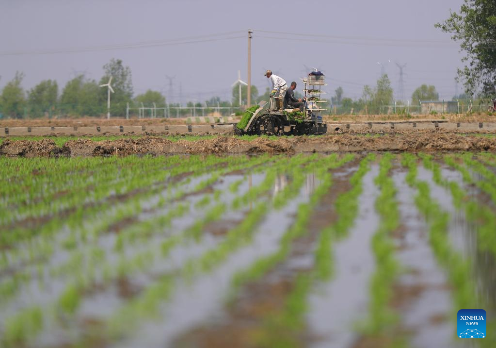 Farmers transplant rice seedlings in a field in Shenbei New District of Shenyang, northeast China's Liaoning Province, May 18, 2022. Liaoning has stepped up efforts on farming activities as the temperature rises recently. By May 17, the province's spring sowing area of crops has reached 48,645,000 mu (3,243,000 hectares). (Xinhua/Yang Qing)
