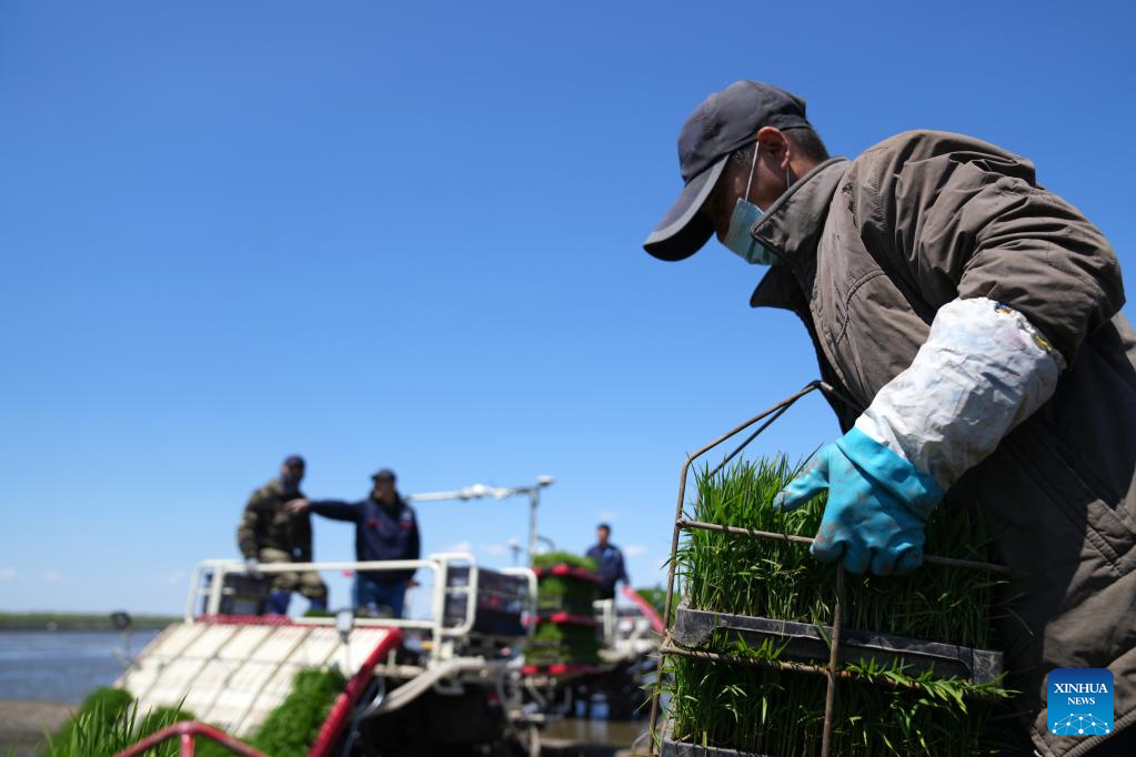 Farmers transplant rice seedlings in a field in northeast China's Heilongjiang Province, May 18, 2022. Spring farming activities are in full swing across Heilongjiang Province. By May 17, the province's spring sowing area of crops has reached 190 million mu (about 12.67 million hectares). (Xinhua/Wang Jianwei)