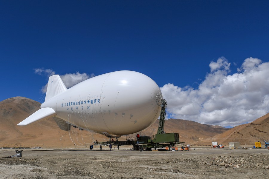Photo taken on May 12, 2022 shows floating airship "Jimu No.1" type III in Zhaxizom Township of Tingri County, southwest China's Tibet Autonomous Region. (Xinhua/Jiang Fan)