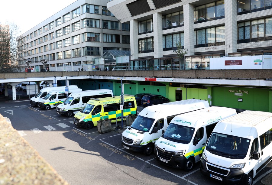 Ambulances are seen in a hospital in London, Britain, March 27, 2022. (Xinhua/Li Ying)