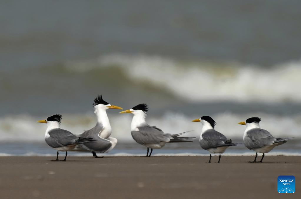 (220522) -- FUZHOU, May 22, 2022 (Xinhua) -- Chinese crested terns rest in the Minjiang River estuary nature reserve in southeast China's Fujian Province, May 20, 2022. Located on a major bird migration route between East Asia and Australia, the Minjiang River estuary nature reserve is a stopover for over 50,000 waterfowls each year. (Xinhua/Wei Peiquan)