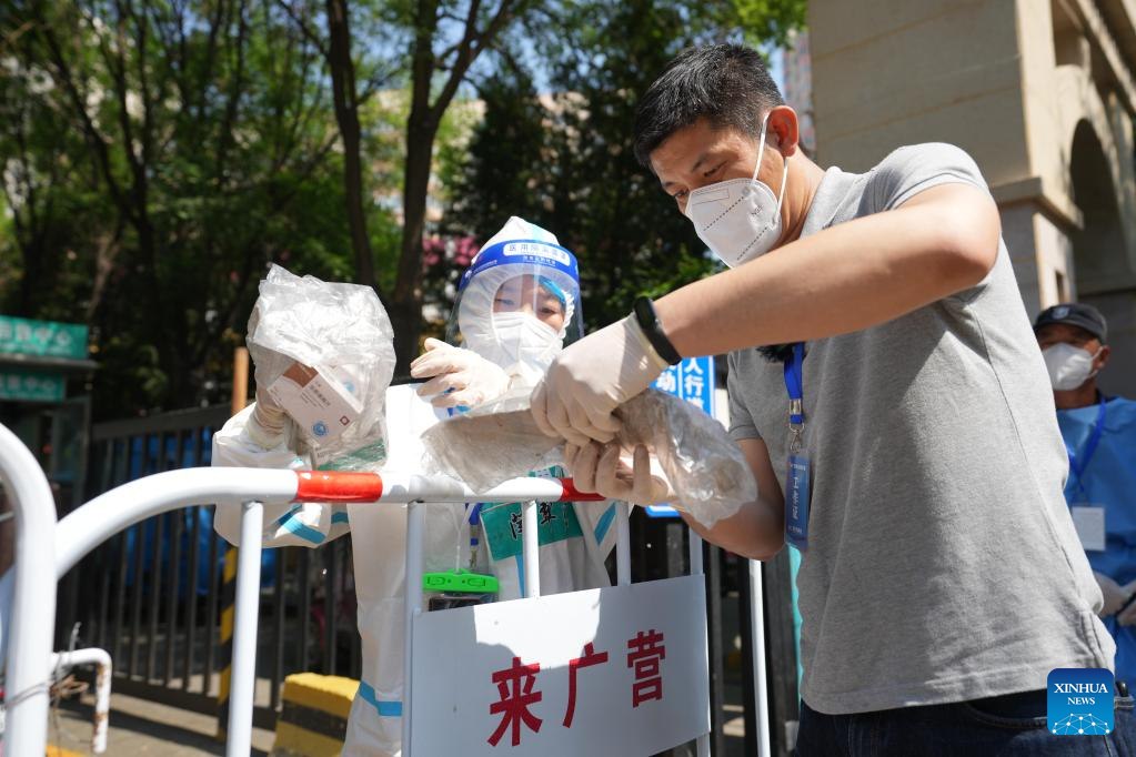 Mei Xiaodong (R) passes the medicine ordered by residents to a staff member in a community for delivery in Chaoyang District in Beijing, capital of China, May 21, 2022.