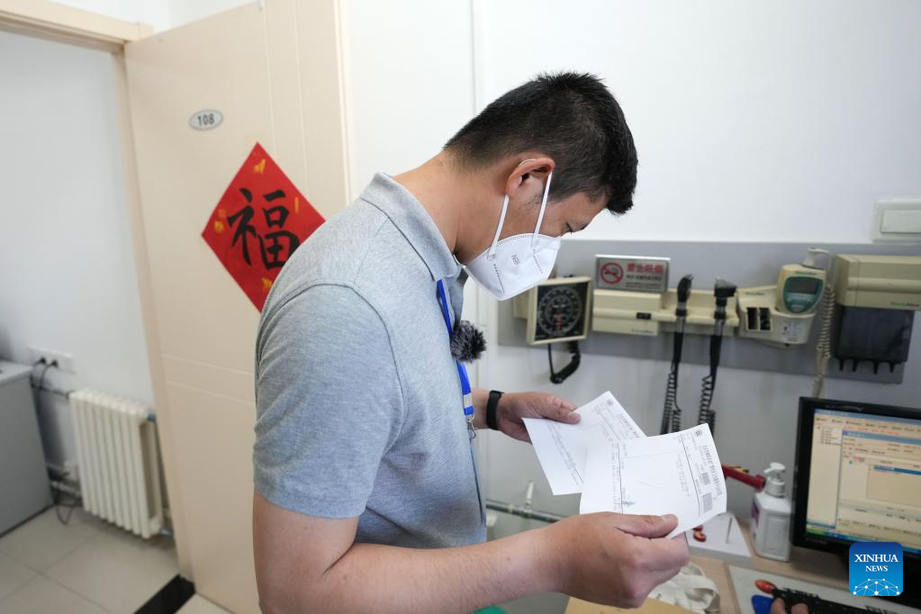 Mei Xiaodong checks the medical prescriptions for residents under home quarantine in Chaoyang District in Beijing, capital of China, May 21, 2022.