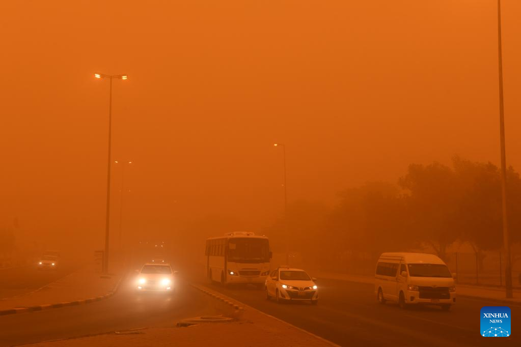 Photo taken on May 23, 2022 shows cars on a road amid strong dust storm in Kuwait City, Kuwait. (Xinhua)