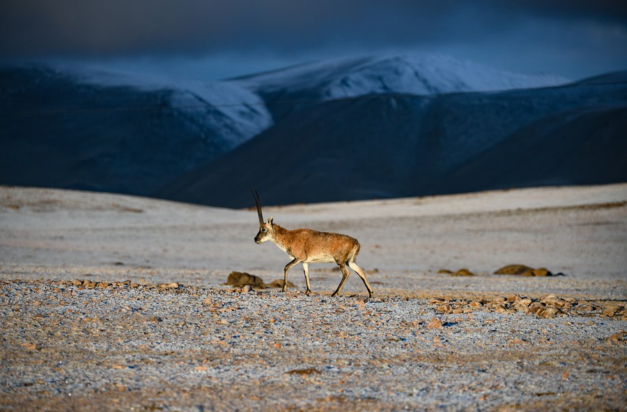 A Tibetan antelope is pictured at the Qiangtang National Nature Reserve in southwest China's Tibet Autonomous Region, Sept. 25, 2021. (Xinhua/Jigme Dorje)