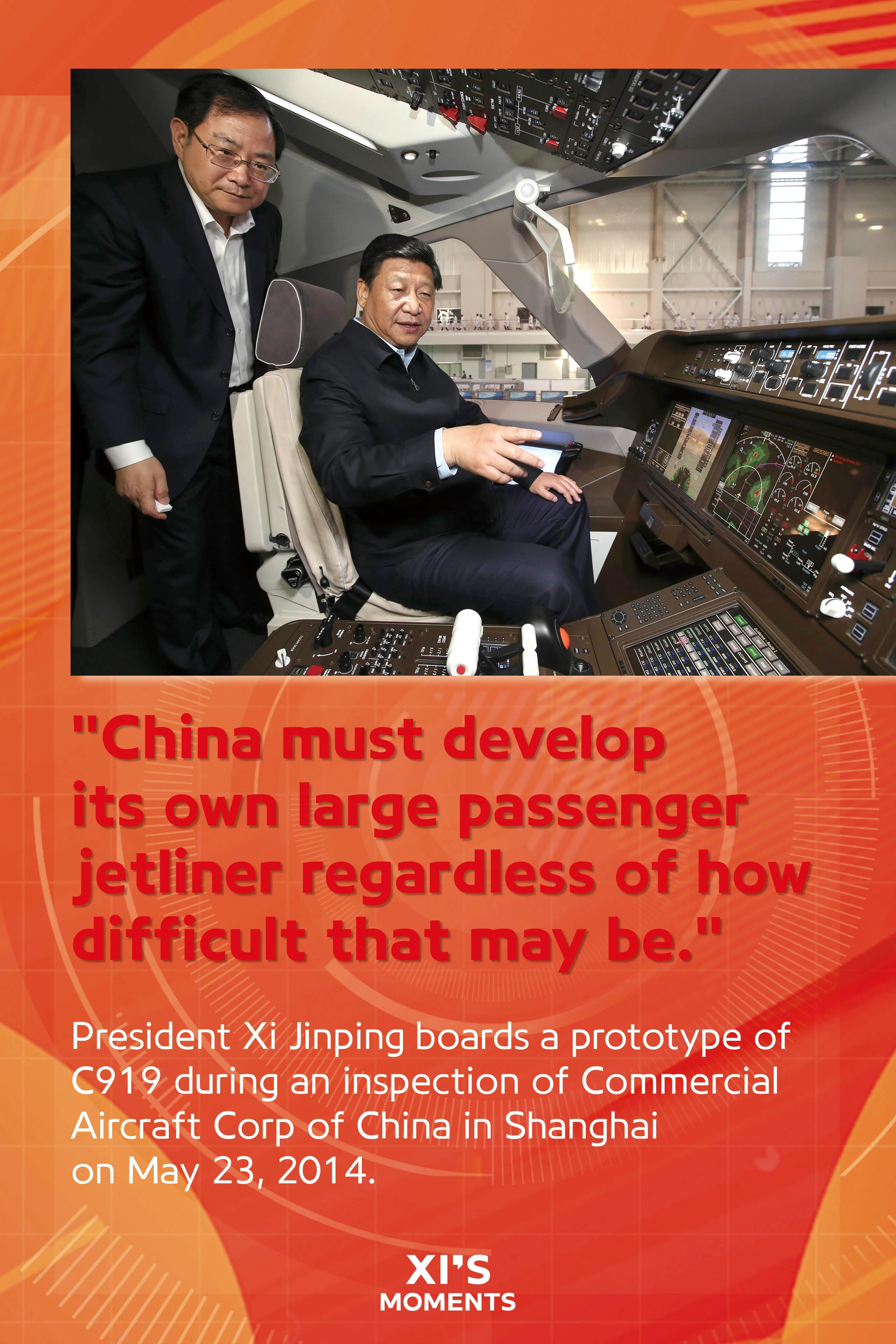 Chinese President Xi Jinping visited the design and research center of Commercial Aircraft Corporation of China (COMAC) in Shanghai on May 23, 2014. He boarded a prototype jet, talked with engineers and called for developing China's own large passenger jetliner.
