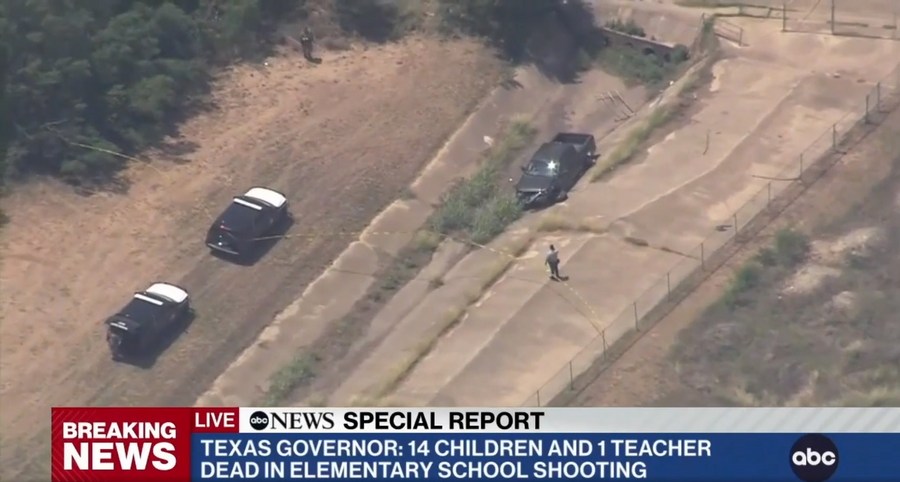 The screenshot taken from the live streaming of ABC shows staff members and vehicles near the Robb Elementary School in Uvalde, Texas, where a gunman killed 14 children and a teacher on May 24, 2022. (Xinhua)