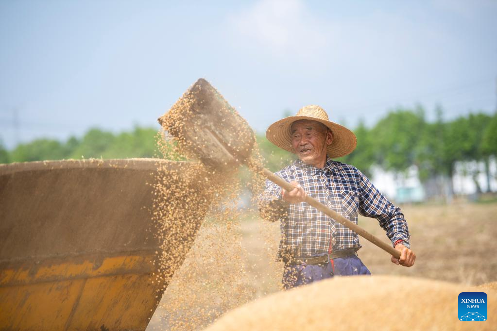 A farmer harvests wheat in the fields in Changyun Village of Kunshan, east China's Jiangsu Province, May 21, 2022. (Photo by Wang Xuzhong/Xinhua)