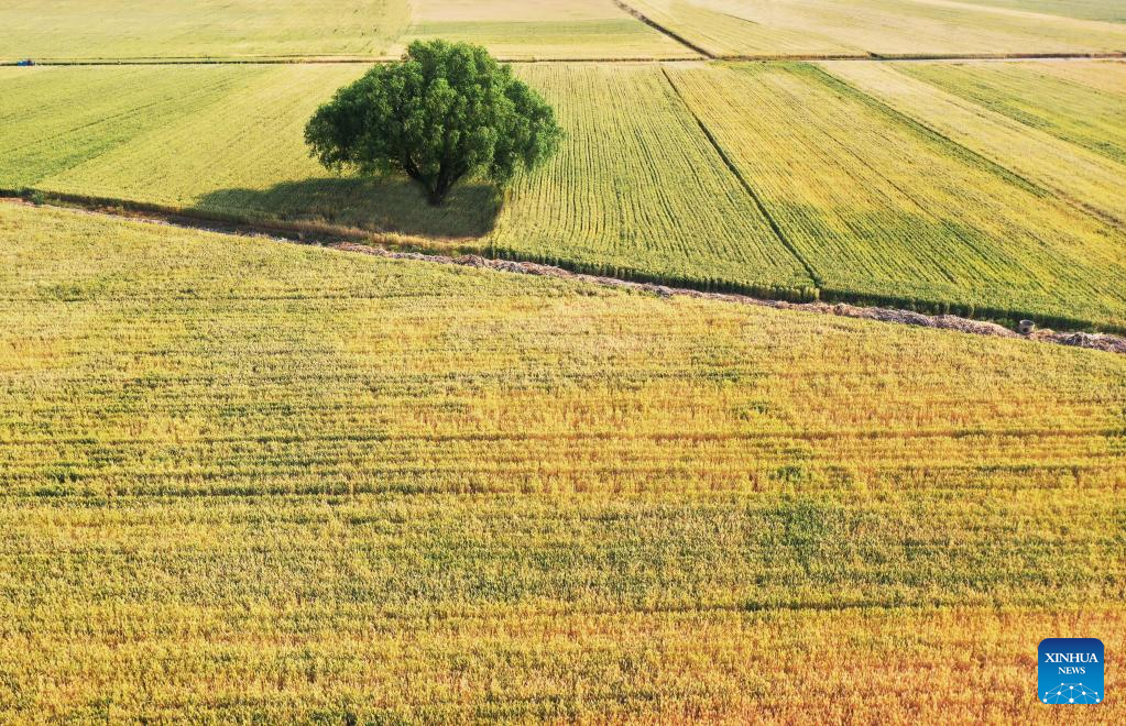 Aerial photo taken on May 20, 2022 shows the wheat fields in Xiji Township of Zaozhuang, east China's Shandong Province. (Photo by Li Zongxian/Xinhua)
