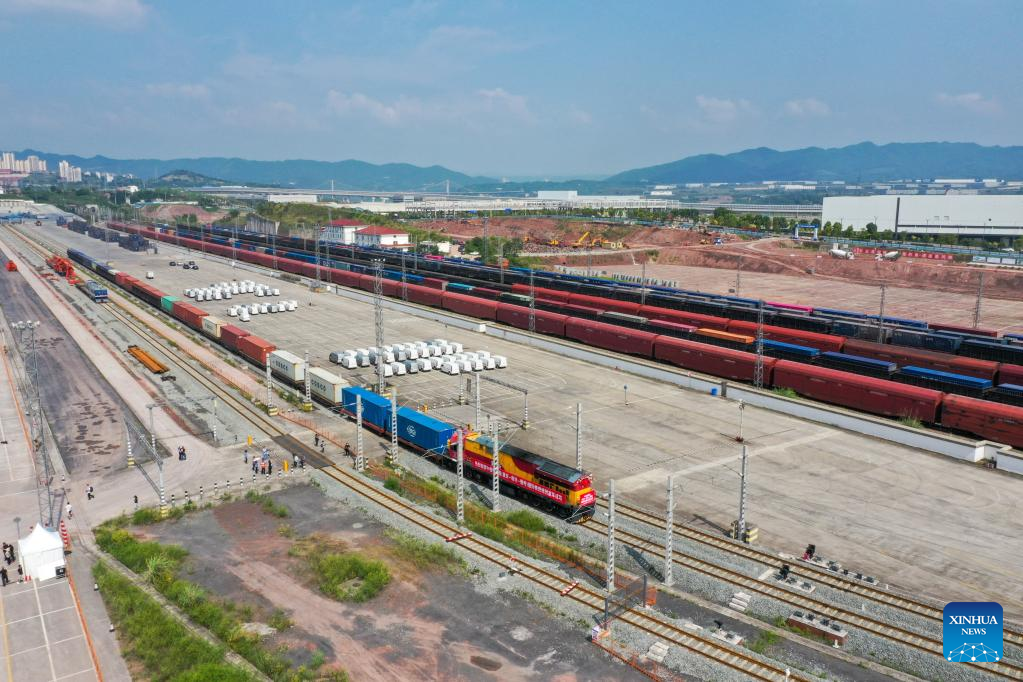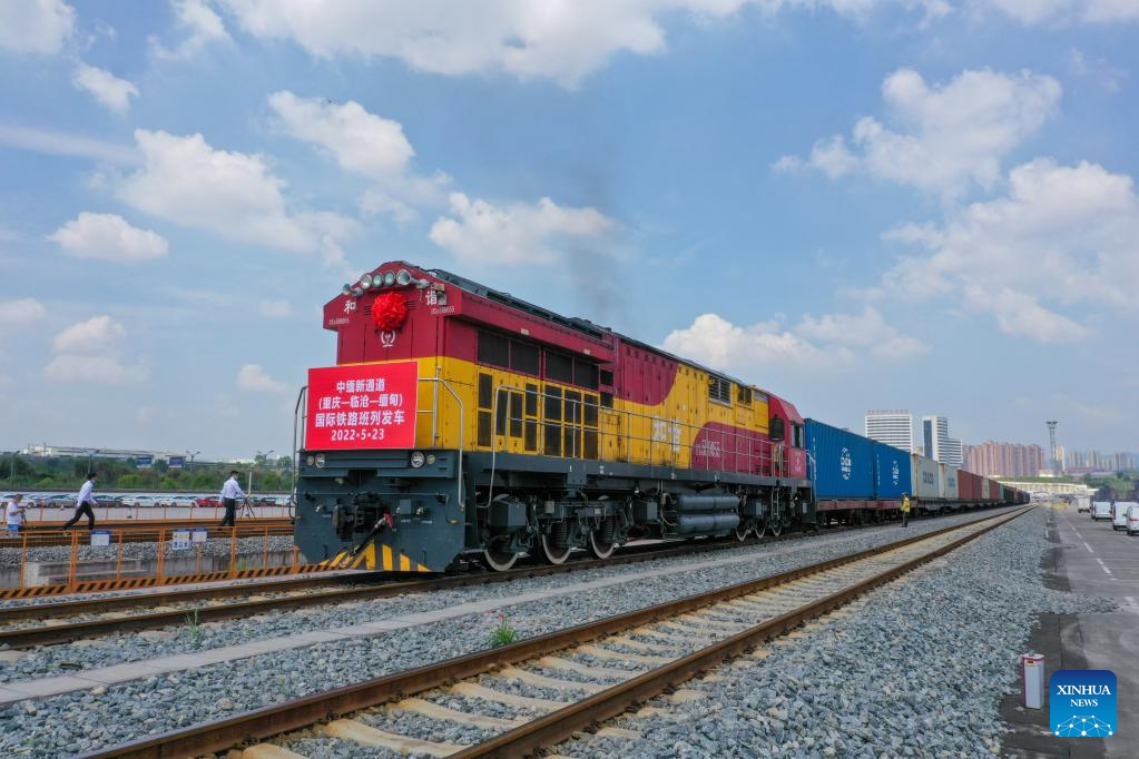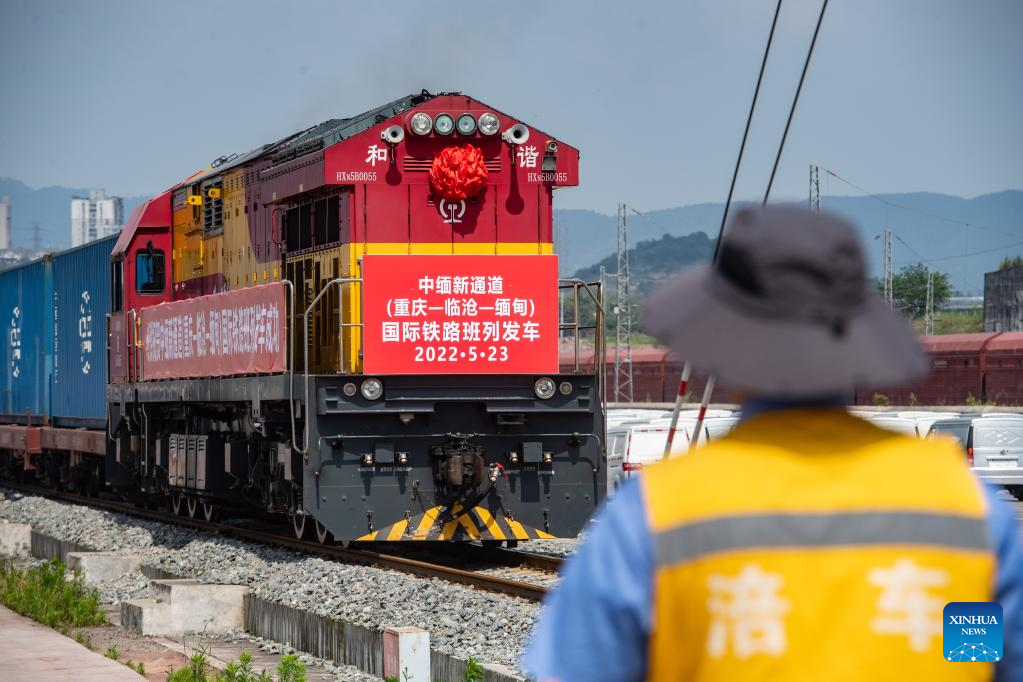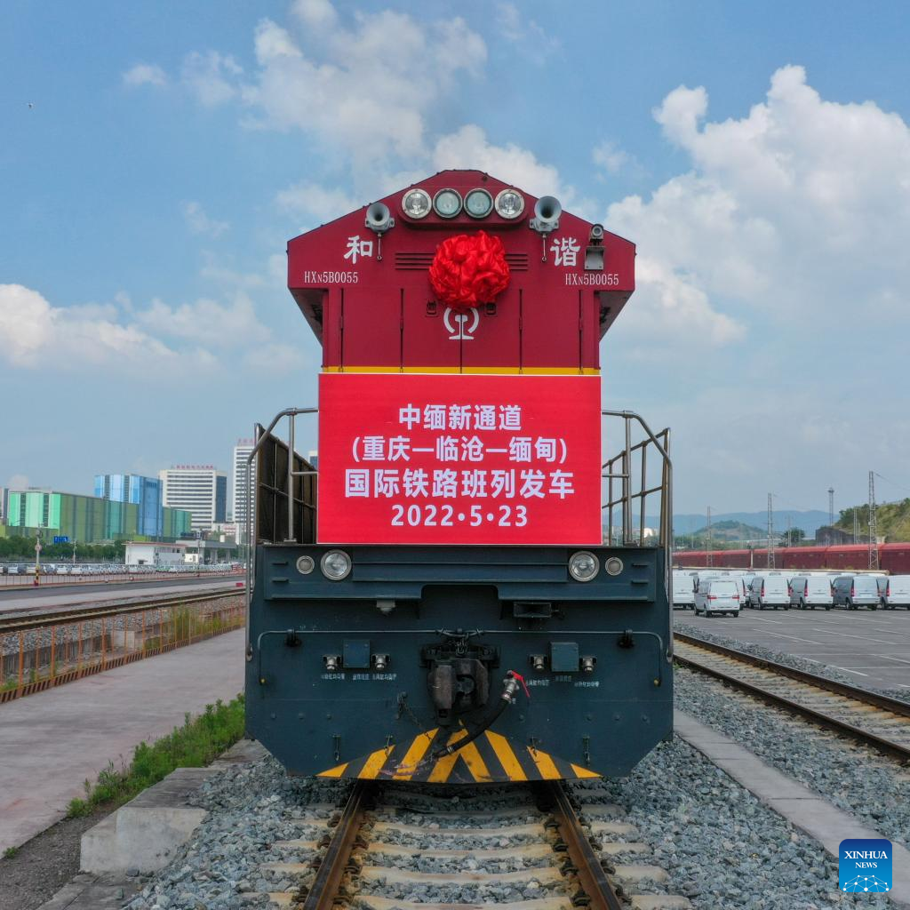 The first international freight train linking Chongqing and Lincang in southwest China with Myanmar is about to set off from the Yuzui station in Chongqing, southwest China, on May 23, 2022. Carrying 60 twenty-foot equivalent units (TEU) of mechanical equipment, electronic and auto parts, the train will pass through Lincang in southwest China's Yunnan province and arrive at Myanmar's Mandalay in about 15 days. This new freight train route can save about 20 days compared with traditional logistics routes and reduce 20 percent of logistics cost. (Xinhua/Tang Yi)