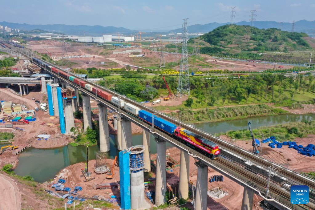 Aerial photo shows the first international freight train linking Chongqing and Lincang in southwest China with Myanmar departing from the Yuzui station in Chongqing, southwest China, on May 23, 2022. Carrying 60 twenty-foot equivalent units (TEU) of mechanical equipment, electronic and auto parts, the train will pass through Lincang in southwest China's Yunnan province and arrive at Myanmar's Mandalay in about 15 days. This new freight train route can save about 20 days compared with traditional logistics routes and reduce 20 percent of logistics cost. (Xinhua/Tang Yi)