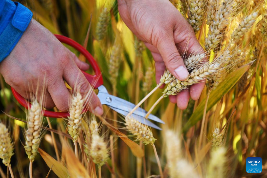 An agricultural technician carries out the yield measurement of wheat at Xialou Village of Yaodian Township in Dengzhou, central China's Henan Province, on May 24, 2022. (Xinhua/Zhang Haoran)
