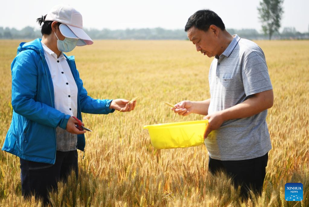 Agricultural technicians check the growth of wheat at Xialou Village of Yaodian Township in Dengzhou, central China's Henan Province, on May 24, 2022. (Xinhua/Zhang Haoran)
