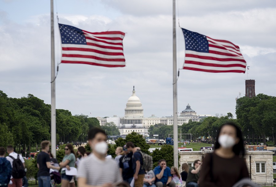 U.S. national flags fly at half-staff at the Washington Monument to mourn 1 million American lives lost to COVID-19 in Washington, D.C., the United States, on May 12, 2022. (Xinhua/Liu Jie)