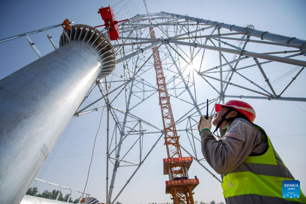 A utility technician works at the construction site of the Anhui section of Baihetan-Zhejiang ultra-high-voltage (UHV) power transmission project by the Yangtze River in Chizhou, east China's Anhui Province, May 25, 2022. (Photo by Zheng Xianlie/Xinhua)