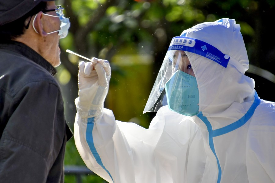 A medical worker takes a swab sample from a citizen for nucleic acid testing in Chaoyang District of Beijing, capital of China, May 13, 2022. (Xinhua/Li Xin)