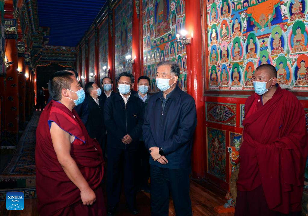 Wang Yang, chairman of the National Committee of the Chinese People's Political Consultative Conference and a member of the Standing Committee of the Political Bureau of the Communist Party of China Central Committee, talks with figures from the religious circles at Gannan Tibetan Autonomous Prefecture in northwest China's Gansu Province, May 24, 2022. Wang made an inspection tour to Gannan Tibetan Autonomous Prefecture from Monday through Wednesday. (Xinhua/Liu Weibing)