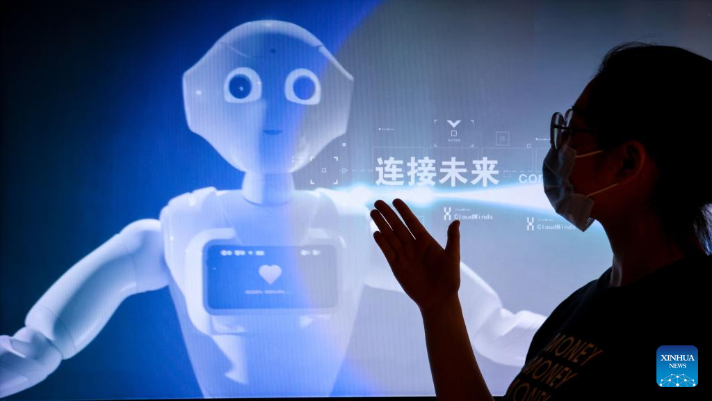 A staff member introduces a promotion video of 5G AI technology at the exhibition center of the national big data (Guizhou) comprehensive pilot zone in southwest China's Guizhou Province, May 26, 2022. The China International Big Data Industry Expo 2022 opened online on Thursday.