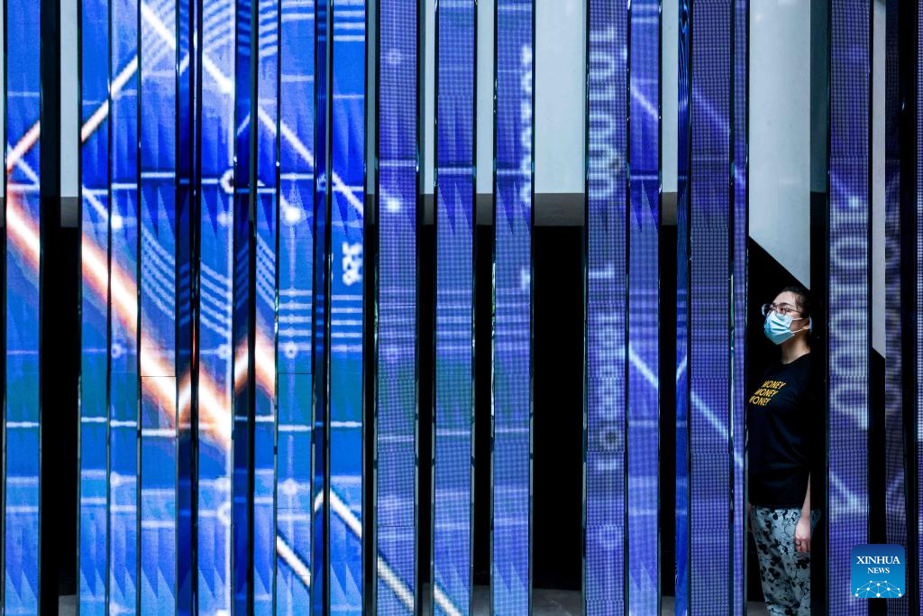 A staff member watches a video at the exhibition center of the national big data (Guizhou) comprehensive pilot zone in southwest China's Guizhou Province, May 26, 2022. The China International Big Data Industry Expo 2022 opened online on Thursday.