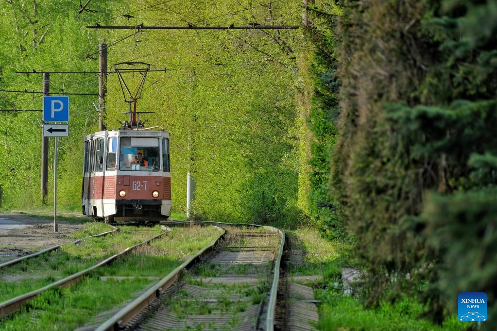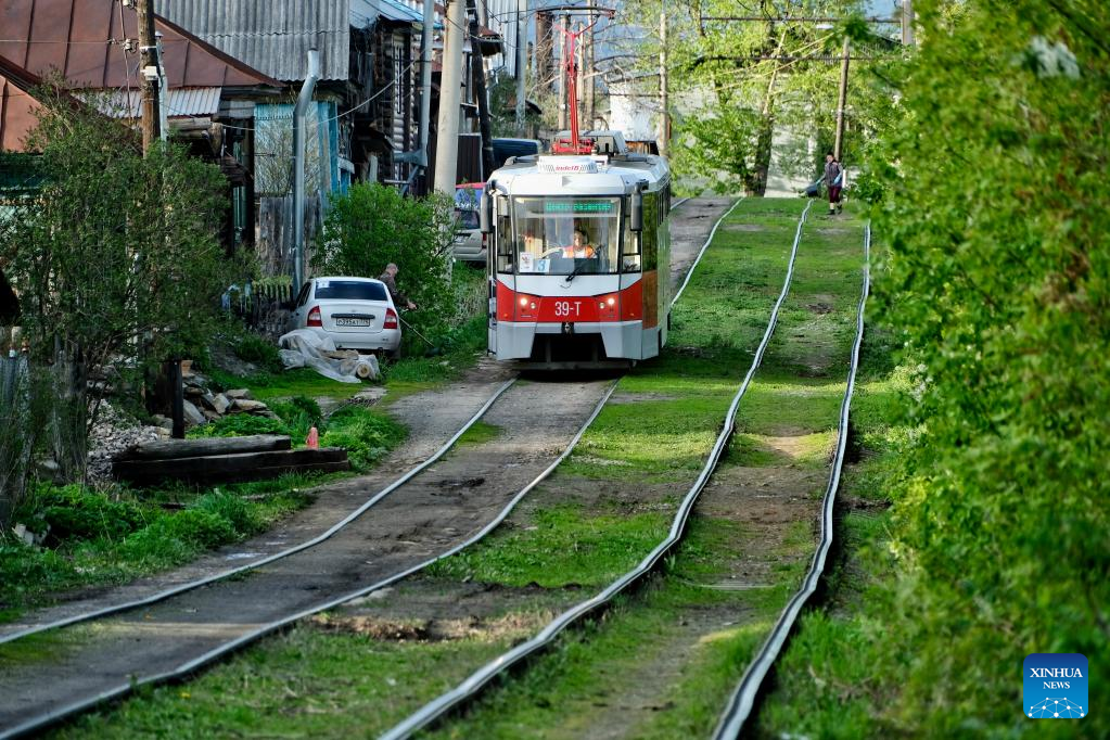 Photo taken on May 26, 2022 shows a tram in Zlatoust, Chelyabinsk region, Russia. (Photo by Evgeny Andreev/Xinhua)