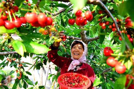 A fruit farmer picks cherries at an orchard in Zhongzhuang township, Yiyuan county, Zibo city, east China’s Shandong province, May 24, 2022. (People’s Daily Online/Zhang Kuifa)