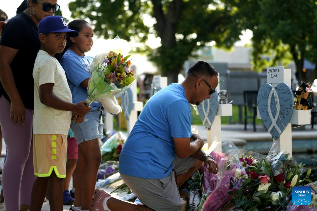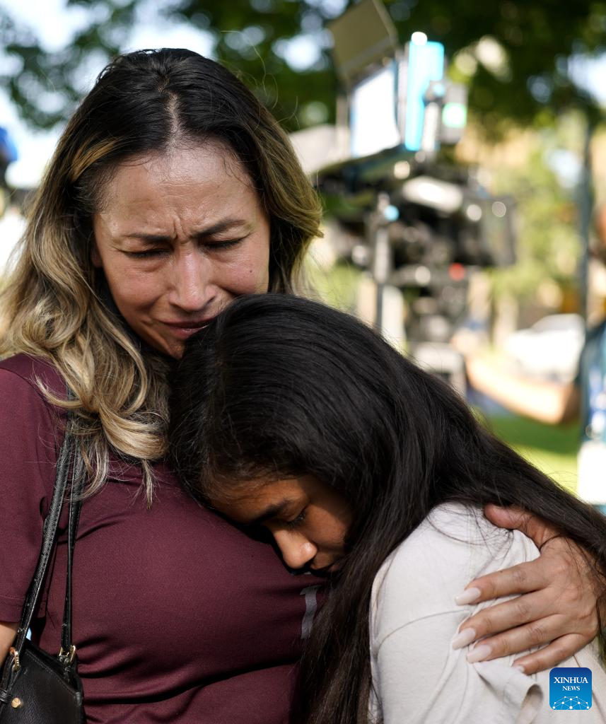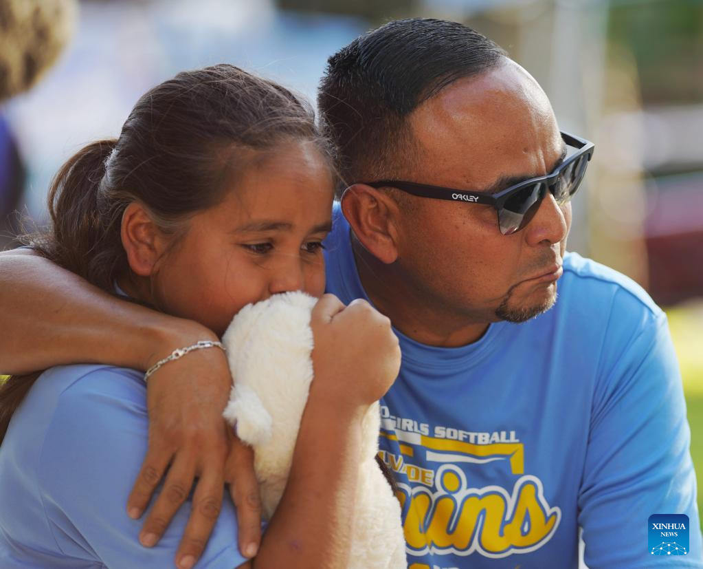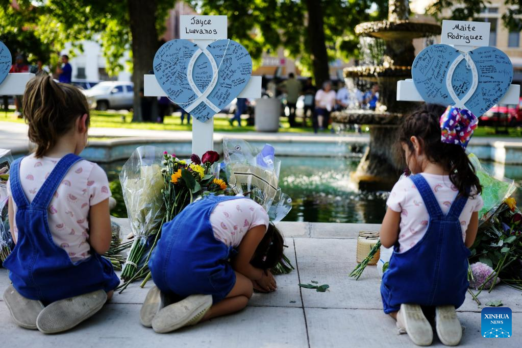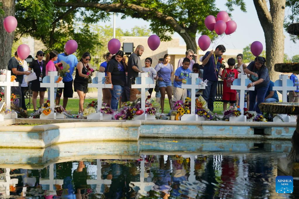 People mourn for victims of a school mass shooting in Uvalde, Texas, the United States, May 26, 2022. At least 19 children and two adults were killed in a shooting at Robb Elementary School in the town of Uvalde, Texas, on Tuesday. (Xinhua/Wu Xiaoling)