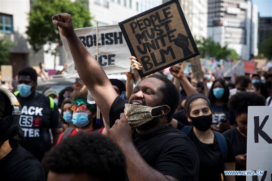Demonstrators take part in a "Black Lives Matter" protest commemorating Juneteenth in the Brooklyn borough of New York, the United States, June 19, 2020. New Yorkers on Friday marked Juneteenth, the day commemorating the emancipation of enslaved African Americans, with marches and protests as the country is having a new moment of reckoning about racial injustice. (Photo by Michael Nagle/Xinhua)