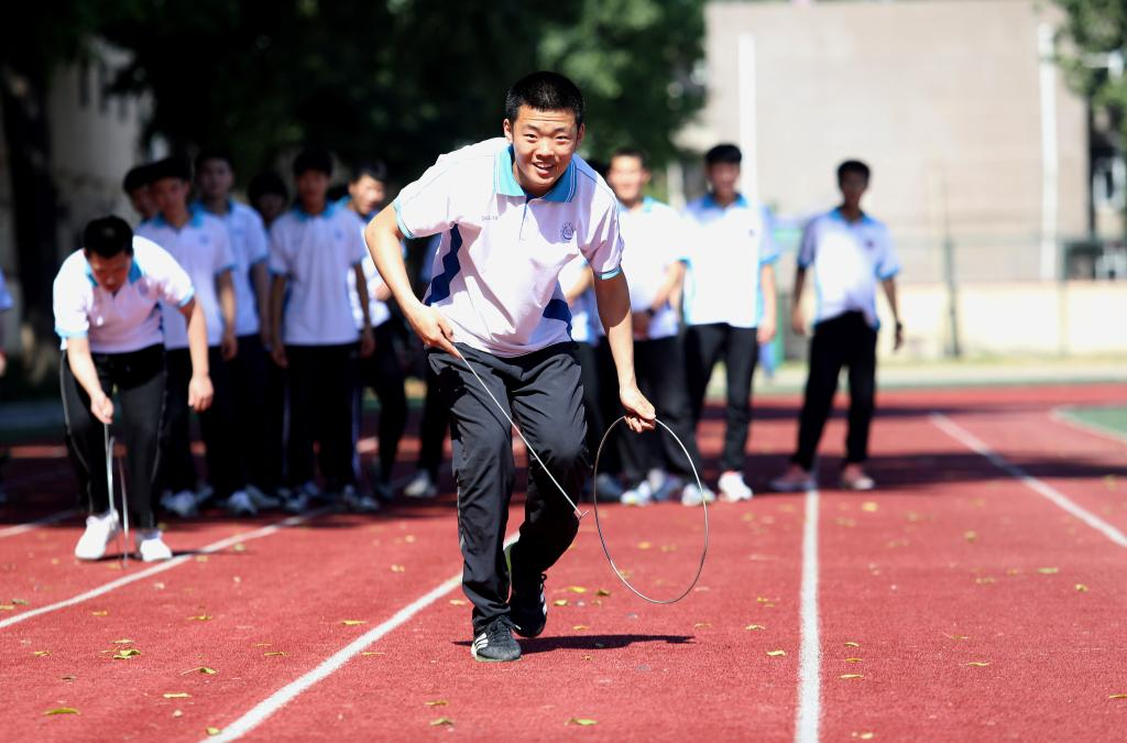 Senior high school students take part in a rope skipping game on campus at a high school in Jinzhou, north China's Hebei Province, May 27, 2022.