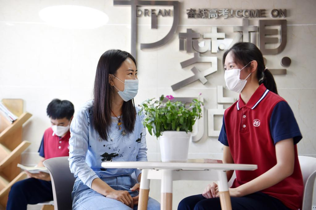 A school psychologist chats with a senior high school student at the Shijiazhuang No.22 High School in Shijiazhuang, north China's Hebei Province, May 27, 2022.