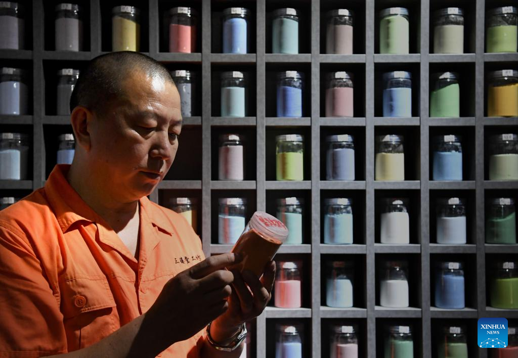 Cheng Yucai selects dyestuff at his workshop in Xinmi City, central China's Henan Province, on May 24, 2022. (Xinhua/Li An)