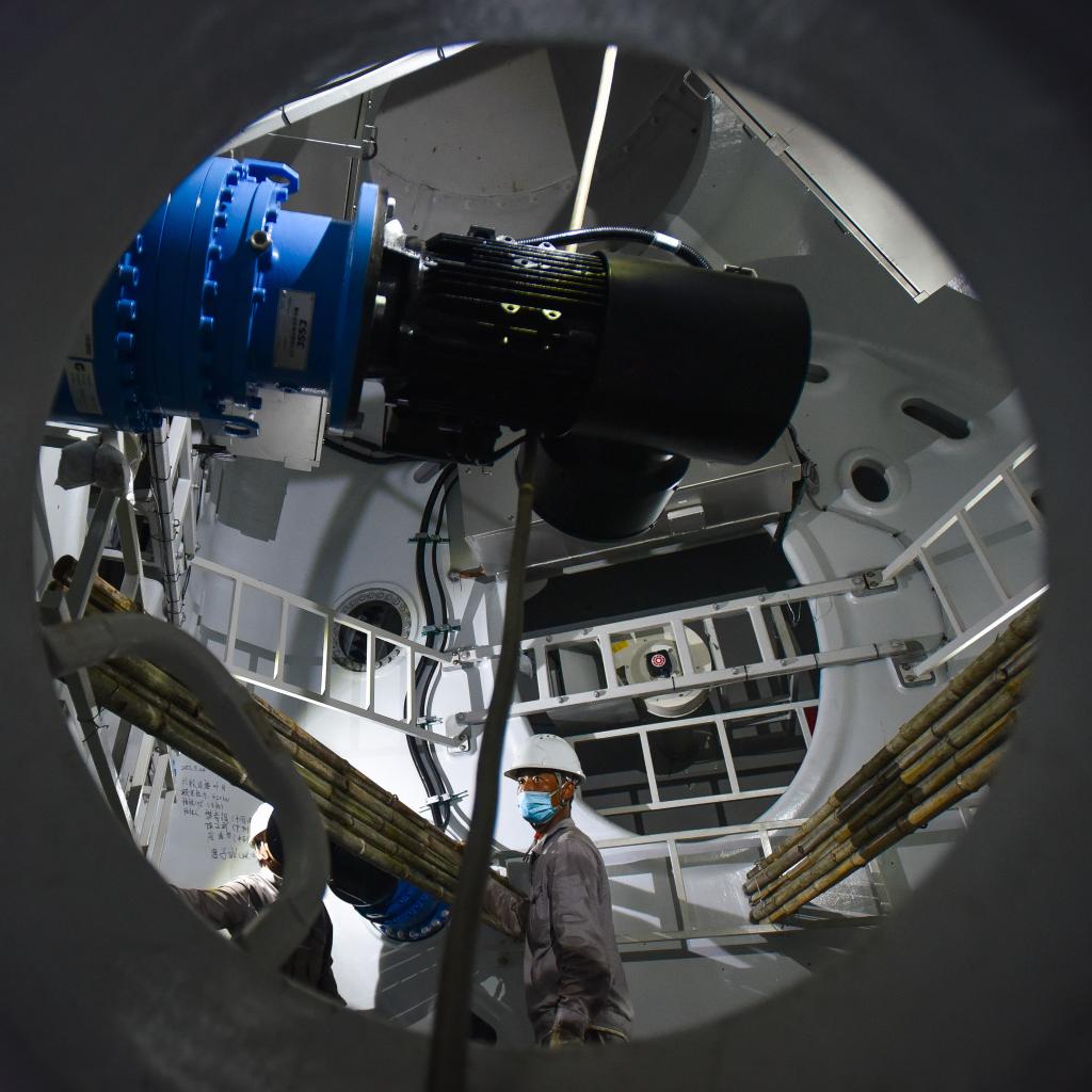 An engineer works in a deep-sea floating wind power equipment "Fuyao" in south China's Guangdong Province, May 26, 2022. China's first deep-sea floating wind power equipment "Fuyao" was towed in Maoming, south China's Guangdong Province on Sunday. It will be tested in Luodousha sea area where the average water depth is 65 meters. "Fuyao" wind turbine is equipped with 6.2 megawatt typhoon-resistant wind power generating units. (Xinhua/Liu Dawei)