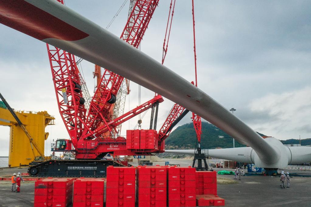 Photo taken on May 26, 2022 shows the blades of a deep-sea floating wind power equipment "Fuyao" being assembled in Maoming, south China's Guangdong Province. China's first deep-sea floating wind power equipment "Fuyao" was towed in Maoming, south China's Guangdong Province on Sunday. It will be tested in Luodousha sea area where the average water depth is 65 meters. "Fuyao" wind turbine is equipped with 6.2 megawatt typhoon-resistant wind power generating units. (Xinhua/Liu Dawei)
