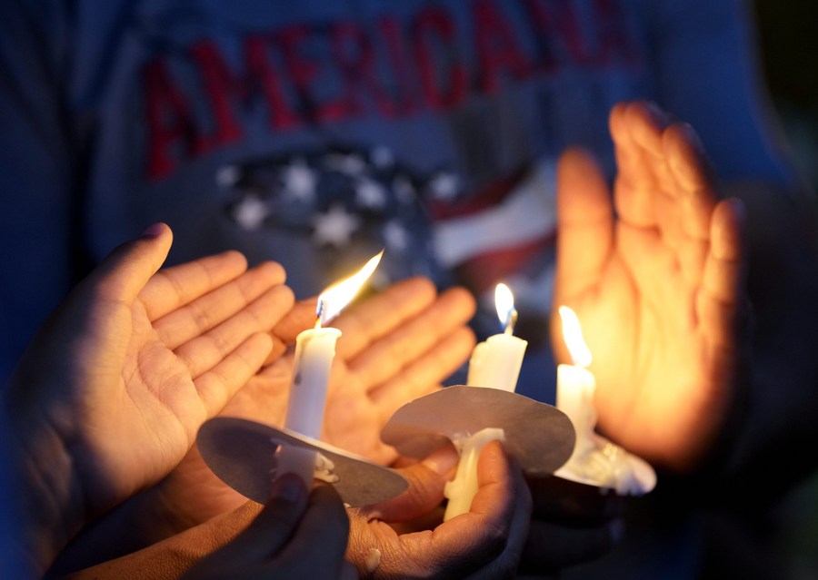 Candles are lit during a vigil to mourn for victims of a school mass shooting at Town Square in Uvalde, Texas, the United States, May 29, 2022. At least 19 children and two adults were killed in the shooting at Robb Elementary School in Uvalde on May 24. (Xinhua/Wu Xiaoling)