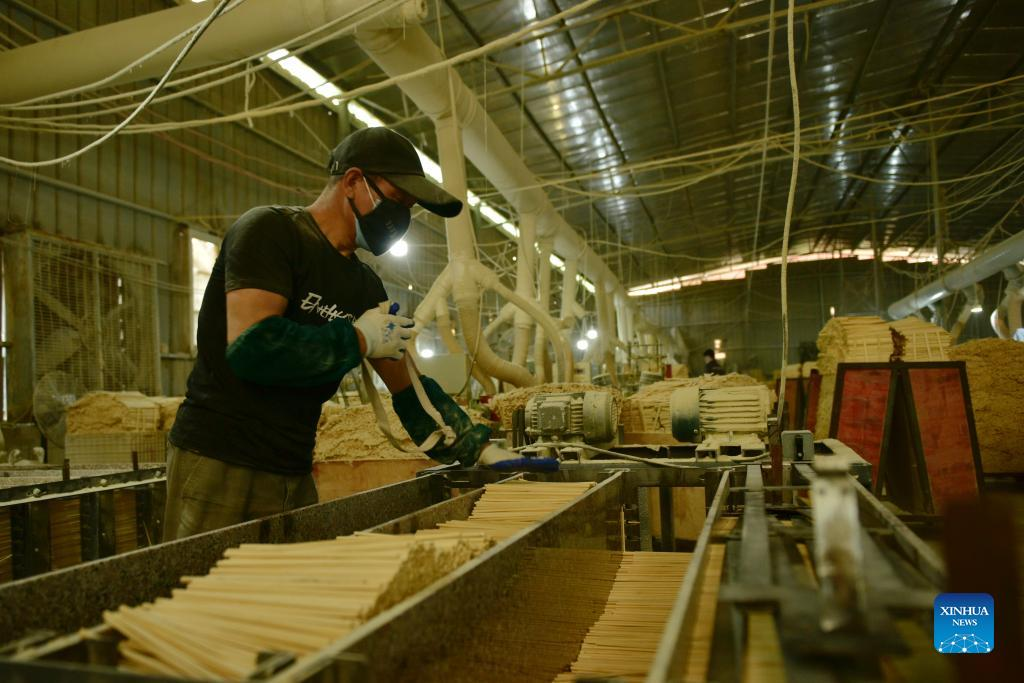 A worker works in the workshop of Guiyuan Bamboo &Wood Factory in Chongyi County of Ganzhou, east China's Jiangxi Province, May 17, 2022. Chongyi, boasting over 48,900 hectares of bamboo forests in the city of Ganzhou, is a major bamboo growing area in China, yielding more than 10 million bamboos for commercial use each year. (Xinhua)