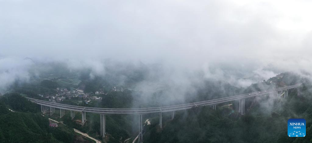 Aerial panoramic photo taken on May 31, 2022 shows the Shitouzhai grand bridge along the Guiyang-Huangping Highway in southwest China's Guizhou Province. The Guiyang-Huangping Highway was opened to traffic on Tuesday, shortening the travel time between Guiyang City and Huangping County of Guizhou Province from the current 3.5 hours to just about one hour and 20 minutes. The main line of this highway stretches 120.6 kilometers and connects Guizhou with the Yangtze River Delta region. (Xinhua/Yang Wenbin)