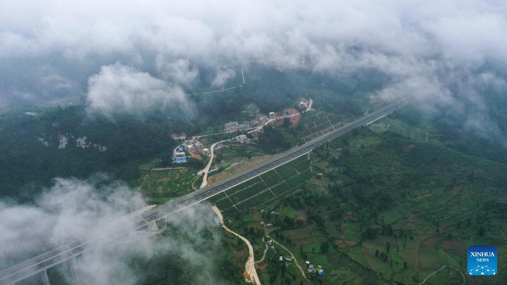 Aerial photo taken on May 31, 2022 shows the Guiyang-Huangping Highway in southwest China's Guizhou Province. The Guiyang-Huangping Highway was opened to traffic on Tuesday, shortening the travel time between Guiyang City and Huangping County of Guizhou Province from the current 3.5 hours to just about one hour and 20 minutes. The main line of this highway stretches 120.6 kilometers and connects Guizhou with the Yangtze River Delta region. (Xinhua/Yang Wenbin)