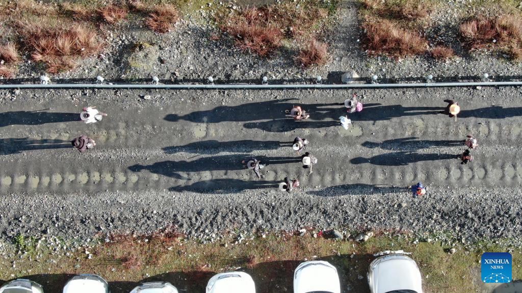 People depart for caterpillar fungus collection in Lainqu Township, Biru County of Nagqu, southwest China's Tibet Autonomous Region, May 26, 2022.