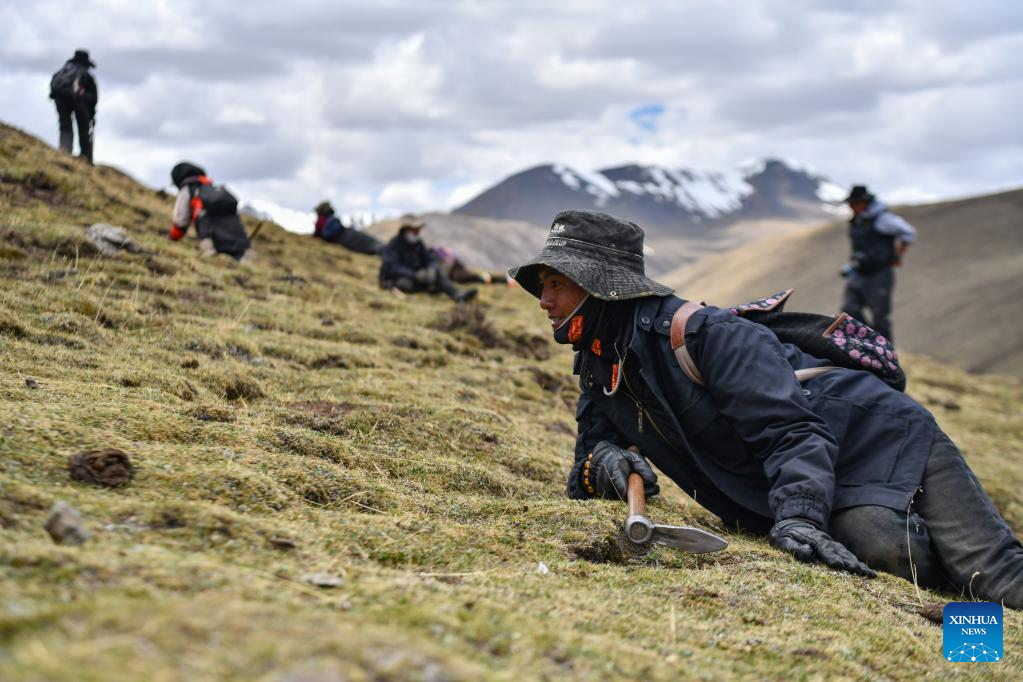 Herdsmen hunt down caterpillar fungus in Biru County of Nagqu, southwest China's Tibet Autonomous Region, May 25, 2022.