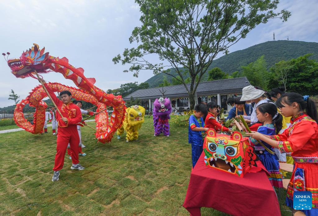 Children attend activities celebrating the upcoming Dragon Boat Festival at a farm in Huzhou City, east China's Zhejiang Province, May 31, 2022. The Dragon Boat Festival would fall on June 3 this year. (Xinhua/Xu Yu)