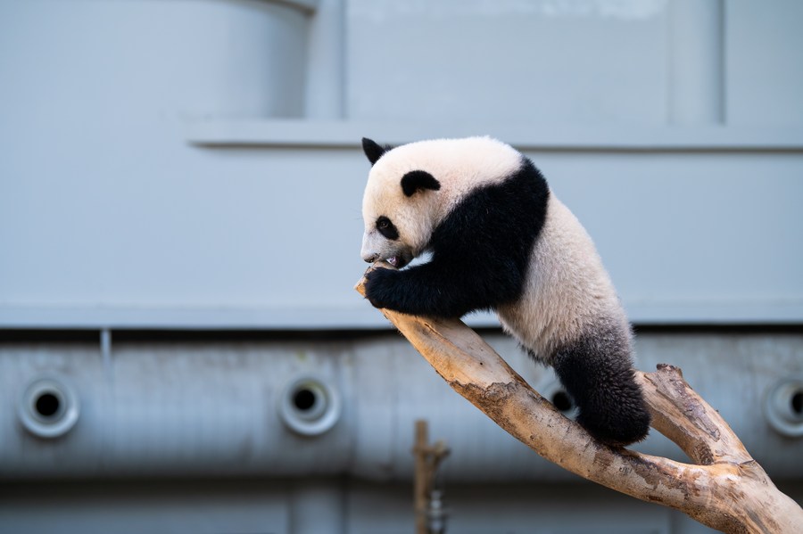 Giant panda cub Sheng Yi plays as celebrating its first birthday at the Giant Panda Conservation Center of Zoo Negara near Kuala Lumpur, Malaysia, May 31, 2022. (Xinhua/Zhu Wei)