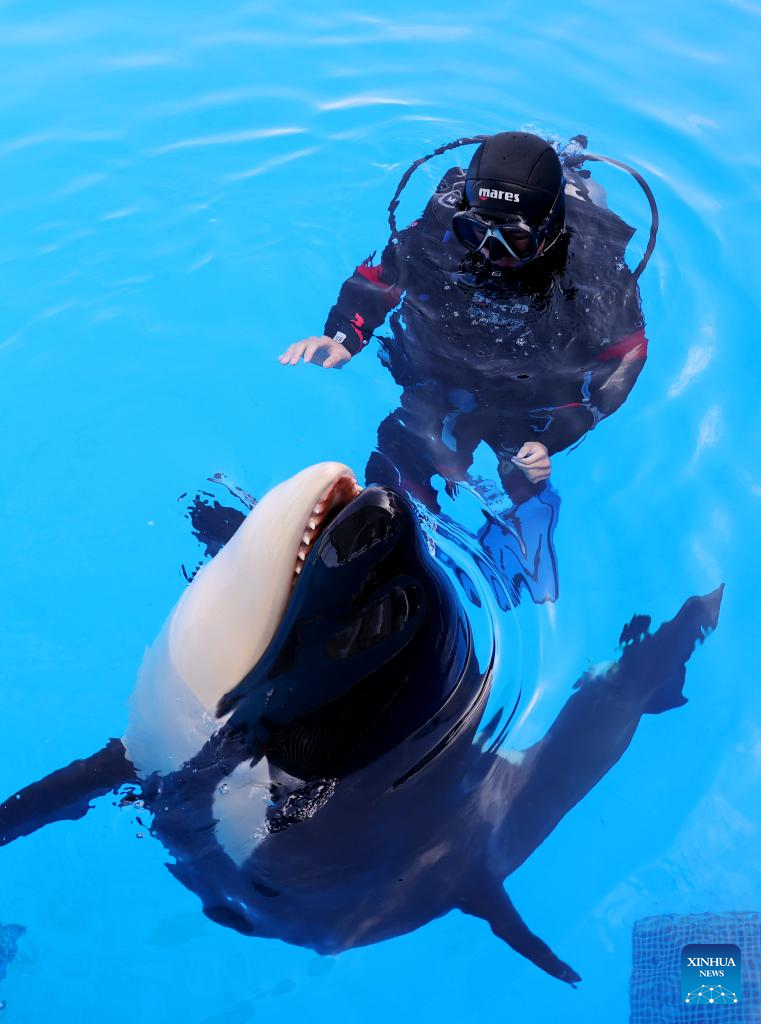 A staff member swims with a killer whale calf at the Shanghai Haichang Ocean Park in east China's Shanghai, May 31, 2022.
