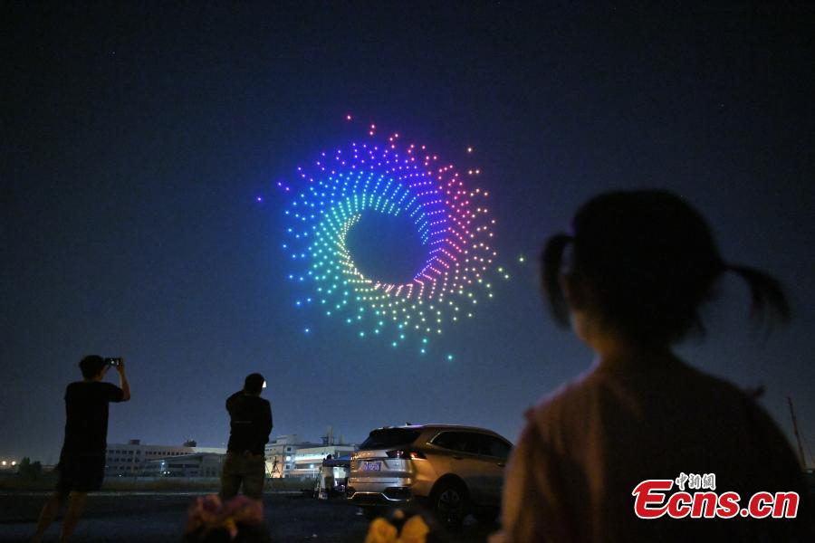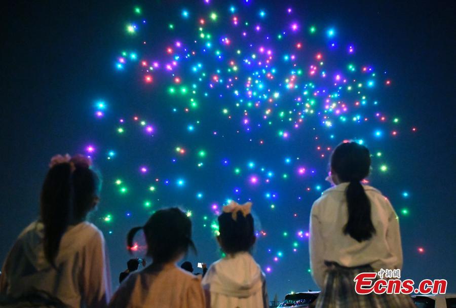 Illuminated drones stage a light show to celebrate the Children's Day in Tianjin, May 31, 2022. (Photo: China News Service/Tong Yu)