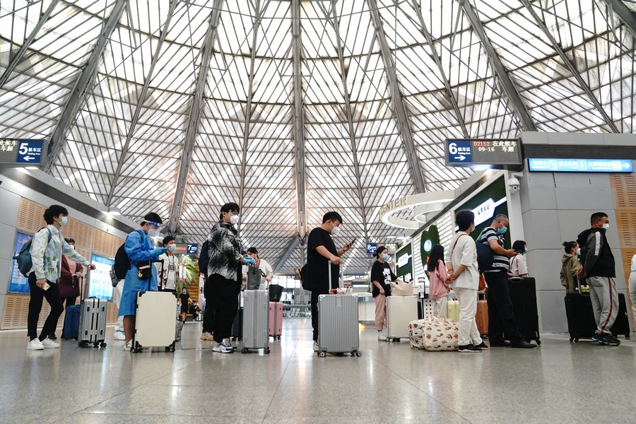 Travelers line up at the waiting area of Shanghai South Railway Station in east China's Shanghai, June 1, 2022. (Xinhua/Ding Ting)