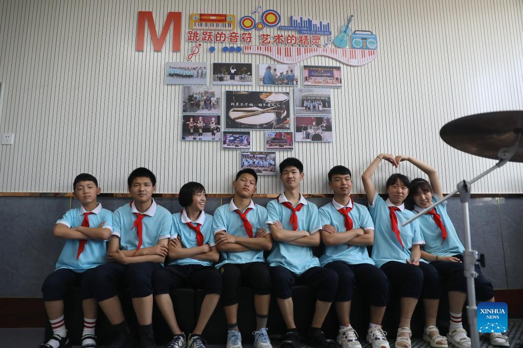 Some members of the band "Against the wind" pose for a photo at the music classroom of Xinji Special Education School in Xinji, north China's Hebei Province, May 31, 2022. In the municipal special-education school of Xinji City, Hebei Province, a jazz drumming band named "Against the Wind" is making hopeful beats in world of silence. Founded in December 2018, the band is home to 10 students with hearing impairment or intellectual disability. The band has been undergoing systematic and hard training since its establishment and the endeavors paid off when the band made a stunning rendering in the city's cultural performance among primary and secondary school students. "I named the band 'Against the Wind' to encourage the students to hold onto their dreams, have the grit to face up to challenges and new things as well as fly bravely toward their bright futures," said Sun Shicha, a teacher of the special-education school and the organizer of the jazz drumming band. In 2020, the school created a specialized music classroom, where the band can carry out routine practices. So far, the drum band is able to perform some 10 pieces of music. "The drum band has an invisible and formative influence on teenagers," said Sun. "The students are seen with more resilience and confidence since they joined the band. Meanwhile, their ability in terms of coordination and comprehension have also greatly improved." (Xinhua/Luo Xuefeng)