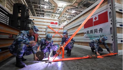 Chinese People’s Liberation Army (PLA) Navy carry relief supplies to Tonga, January 2022. (Photo/Courtesy of China International Development Cooperation Agency)