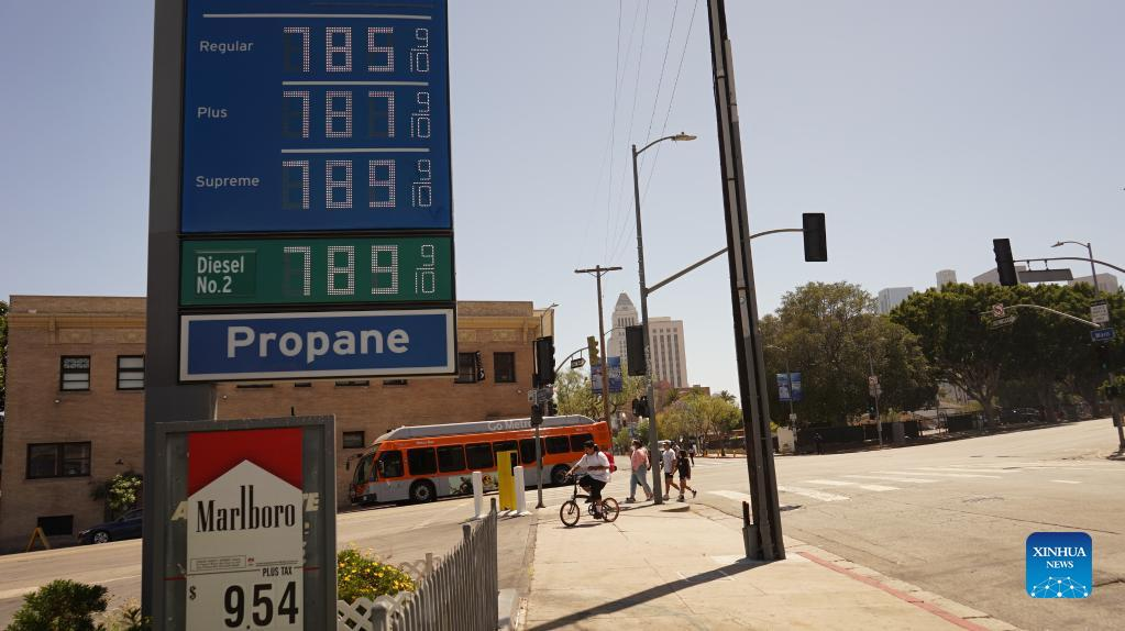 Gas prices are displayed at a gas station in Los Angeles, California, the United States, June 1, 2022. The national average price of regular unleaded gas in the United States soared to a record high of 4.67 U.S. dollars per gallon Wednesday and a further rise is widely expected over the coming months. (Photo by Zeng Hui/Xinhua)