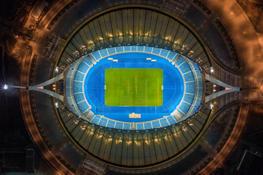 Aerial photo taken on Sept. 9, 2021 shows the China-funded Morodok Techo National Stadium in Phnom Penh, Cambodia. (Photo by Chen Gang/Xinhua)